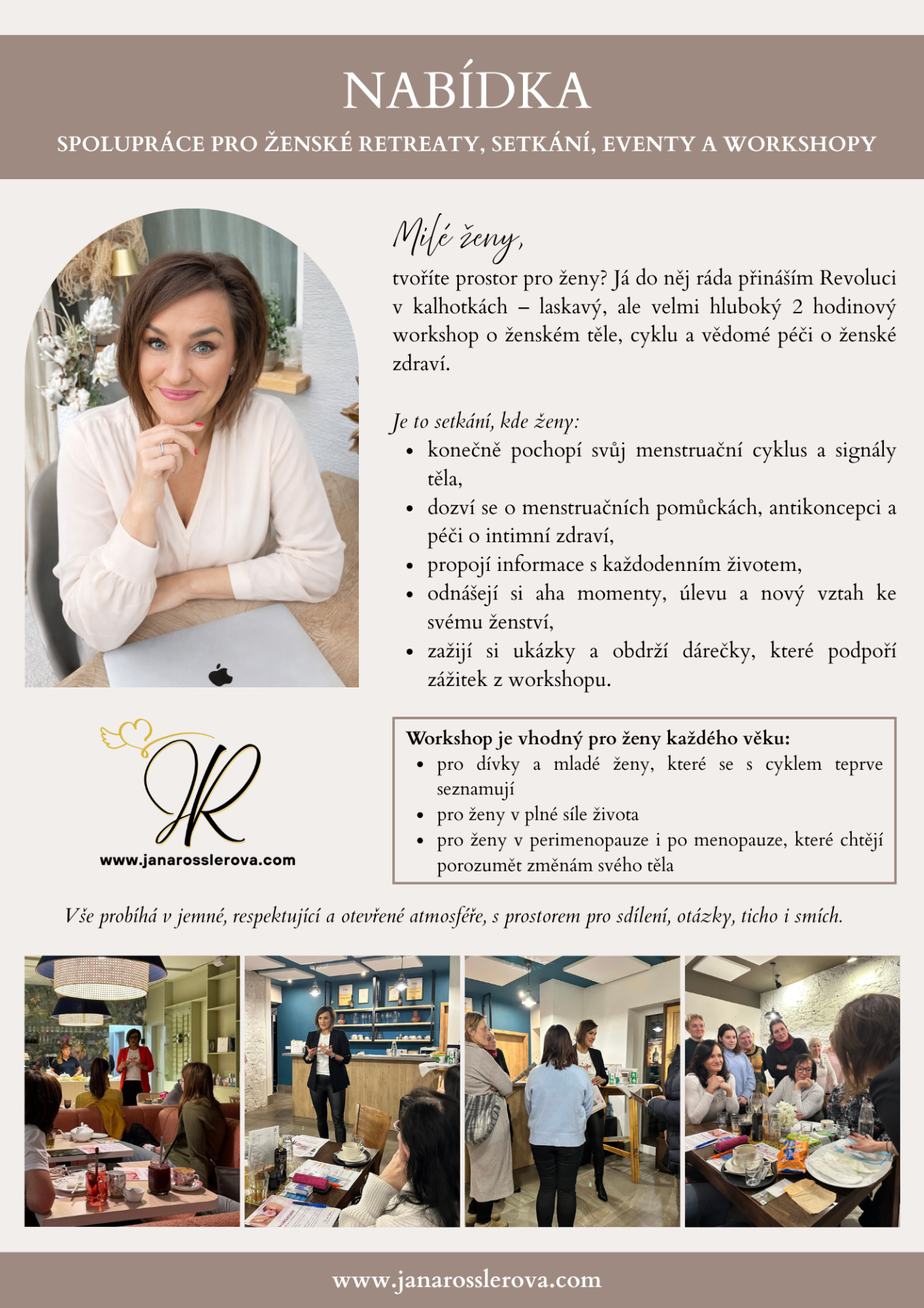 Moje workshopy o ženském zdraví jsou koncipované s maximálním respektem k jedinečnosti každé ženy. Pracuji převážně v malých skupinách, s individuálním přístupem a obsahem upraveným na míru aktuálním potřebám účastnic. Součástí jsou pečlivě připravené, srozumitelné a praktické podklady, inspirativní ukázky i drobné dárky, které podpoří péči o sebe i dlouho po skončení workshopu 💗